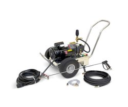 water pressure washer that offers ultimate mobility for on-site applications and is designed to be stored, transported and operated in the vertical and horizontal position. It's features include a reliable 3-piston axial-pump with a brass cylinder head, an automatice pres-sure relief system for protecting the pump and storage options for accessories. This unit is certified to UL and CSA safety standards.